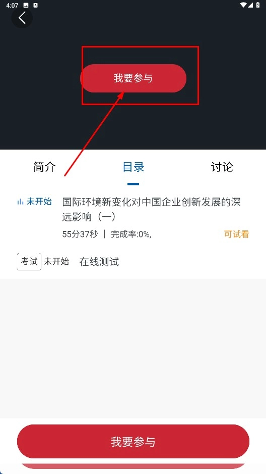 在课程详情页面,点击【我要参与】按钮,即可参与该课程的学习。