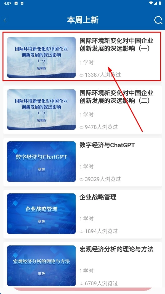 在本周的上新页面中,挑选你想要学习的课程,例如“国际环境新变化对中国企业创新发展的深远影响(一)”,然后点击进入该课程的详情页面。