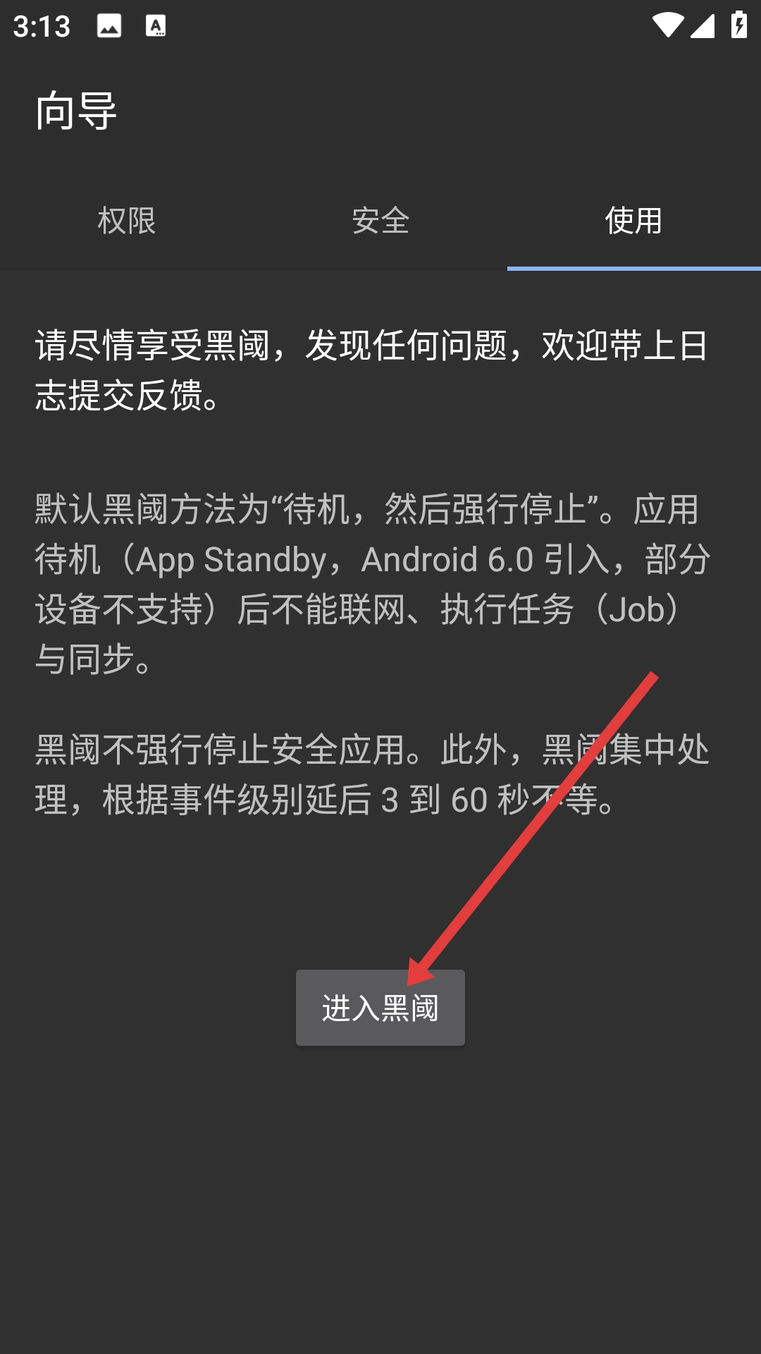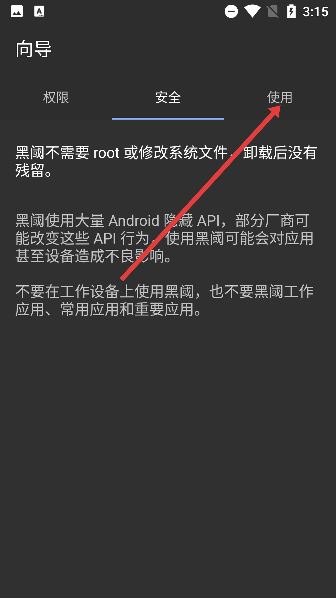 在向导页面中点击【使用】选项,查看黑阈的使用说明,以便了解它的功能特点和使用限制。