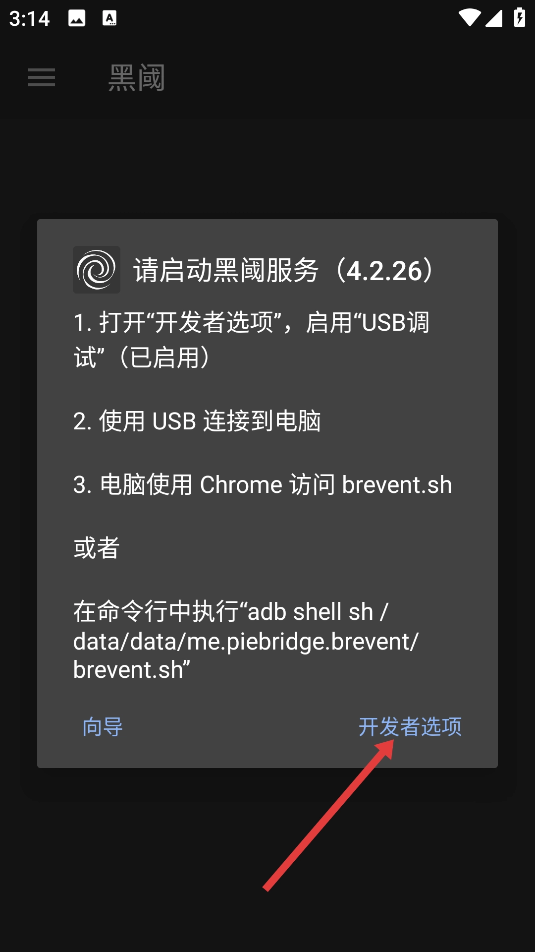 在黑阈的主界面找到并点击【开发者选项】,接着依据提示开启USB调试功能并将设备与电脑相连,最后启动黑阈服务,这样就能完成应用管理功能的配置与使用了。