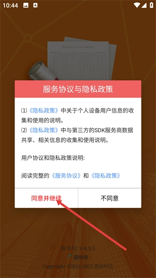 在服务协议与隐私政策页面,仔细阅读《服务协议》和《隐私政策》的内容后,点击【同意并继续】按钮,即可进入主界面。