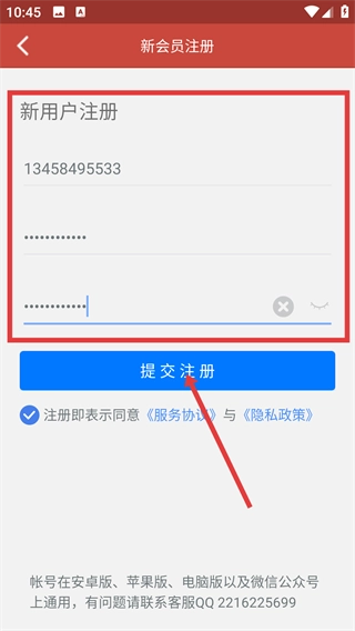 在新会员注册页面,填写手机号、密码等相关信息后,点击【提交注册】按钮,即可完成整个注册流程。