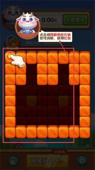 按照提示点击颜色相同的方块,比如【橙色-胡萝卜】方块,点击之后就能消除方块并得到红包。