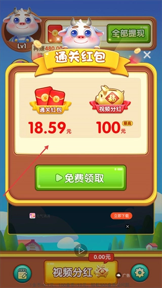 通关后会弹出【通关红包】界面,点击【免费领取】即可获得对应的红包奖励。