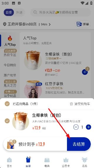 将饮品加入购物车后,点击【去结算】按钮,即可进入订单结算环节,从而完成饮品的购买流程。