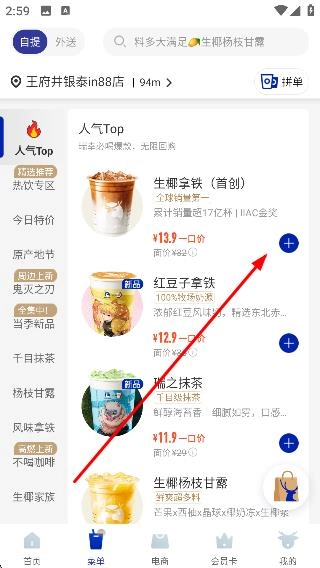在菜单页面挑选目标饮品,例如“生椰拿铁(首创)”,随后进入该饮品的详情页面。