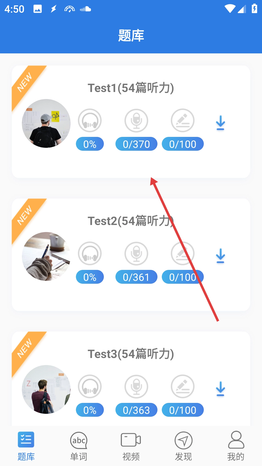 点击【Test1(54篇听力)】,即可进入Test1的试题列表页面。