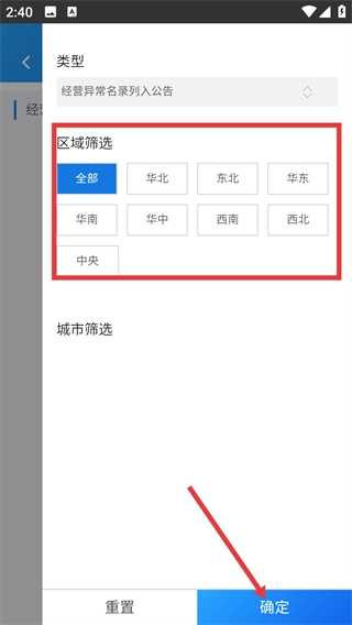 在筛选界面,你可以从【区域筛选】选项里挑选具体的区域,选定之后点击【确定】按钮,就能筛选出该区域内经营异常名录列入公告等相关信息了。