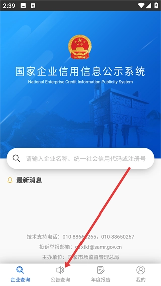 在【国家企业信用信息公示系统】的主界面中,找到底部的【公告查询】选项并点击,即可进入公告查询板块。