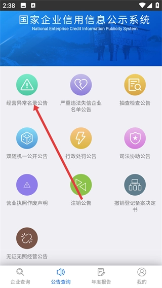 在公告查询页面,点击【经营异常名录公告】的入口,就能查询到经营异常企业名录的相关信息。
