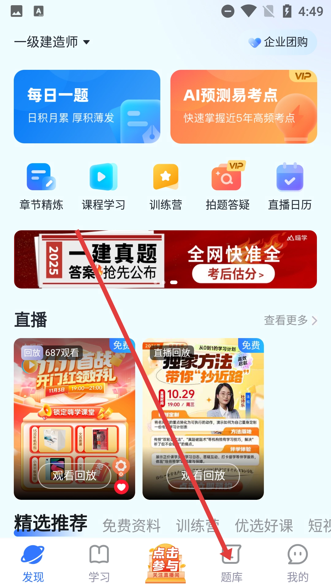 在一级建造师学习的首页,找到页面底部的【题库】按钮并点击,即可进入题库板块。