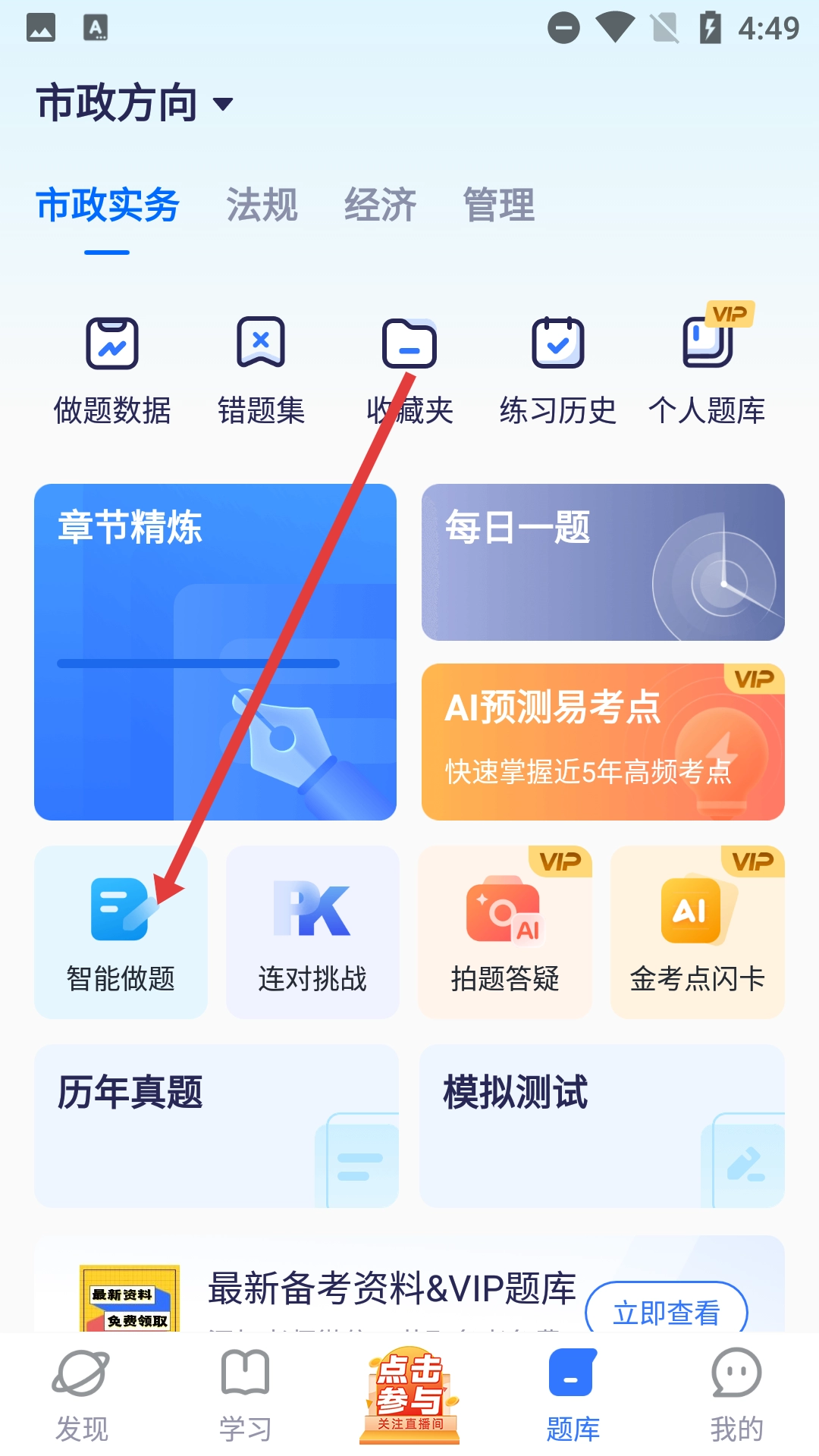 在题库板块中,点击【智能做题】选项,即可进入快速智能练习页面。