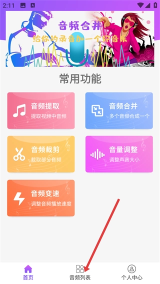 在首页能够使用【音频提取】【音频合并】【音频裁剪】等常用功能,点击底部的【音频列表】就可以查看本地的音频文件。