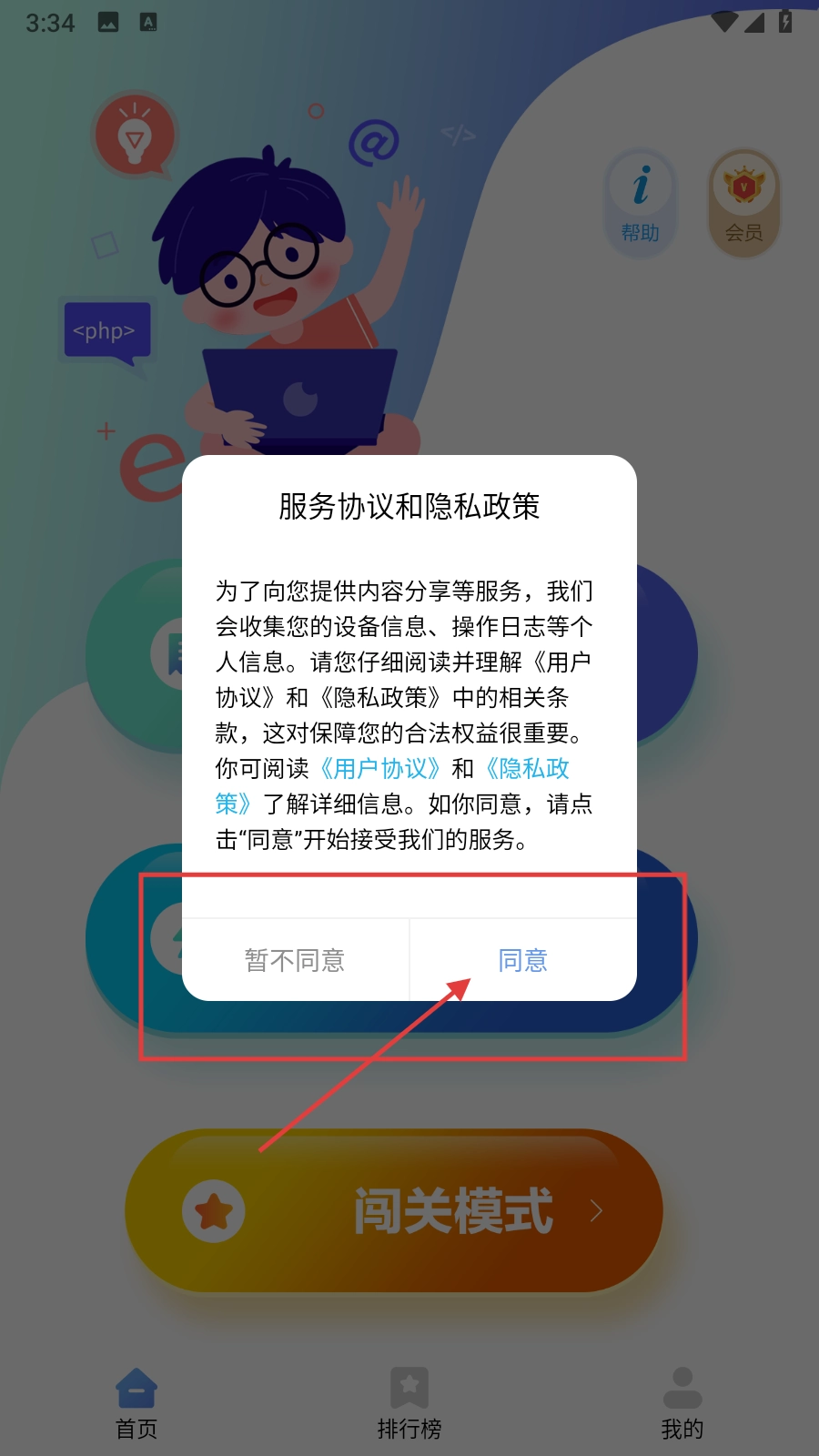 打开软件后,会弹出【服务协议与隐私政策】的提示窗口,请点击【同意】按钮,这样才能继续使用该软件。