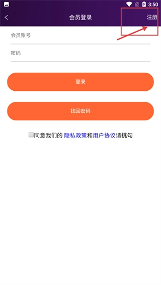 在会员登录页面,点击右上角的【注册】按钮,就能进入会员注册流程。