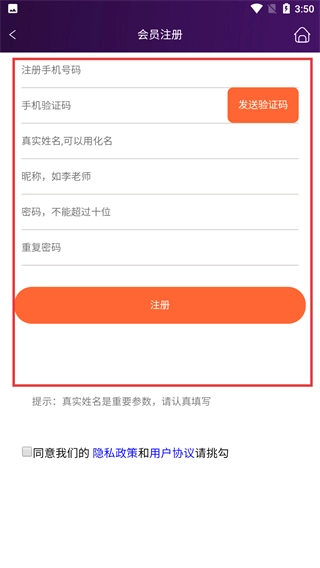 进入会员注册界面后,按照步骤依次填写注册手机号、手机验证码、真实姓名和昵称,随后点击【注册】按钮,即可完成注册流程。