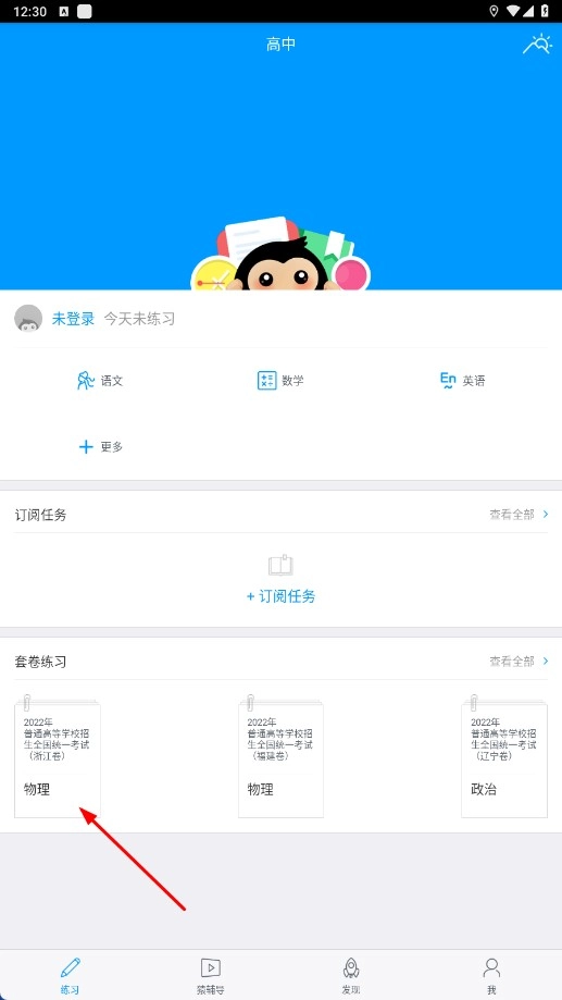 进入高中学习板块,挑选套卷进行练习,例如【2026年普通高等学校招生全国统一考试(浙江卷)物理-套卷名称】。