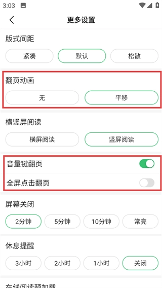 在更多设置页面中,你可以对翻页动画、横竖屏阅读等选项进行设置,以此完成阅读相关的设置操作。