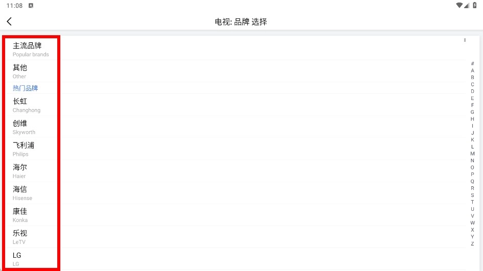 在电视品牌选择页,选择所需电视品牌,如长虹等。