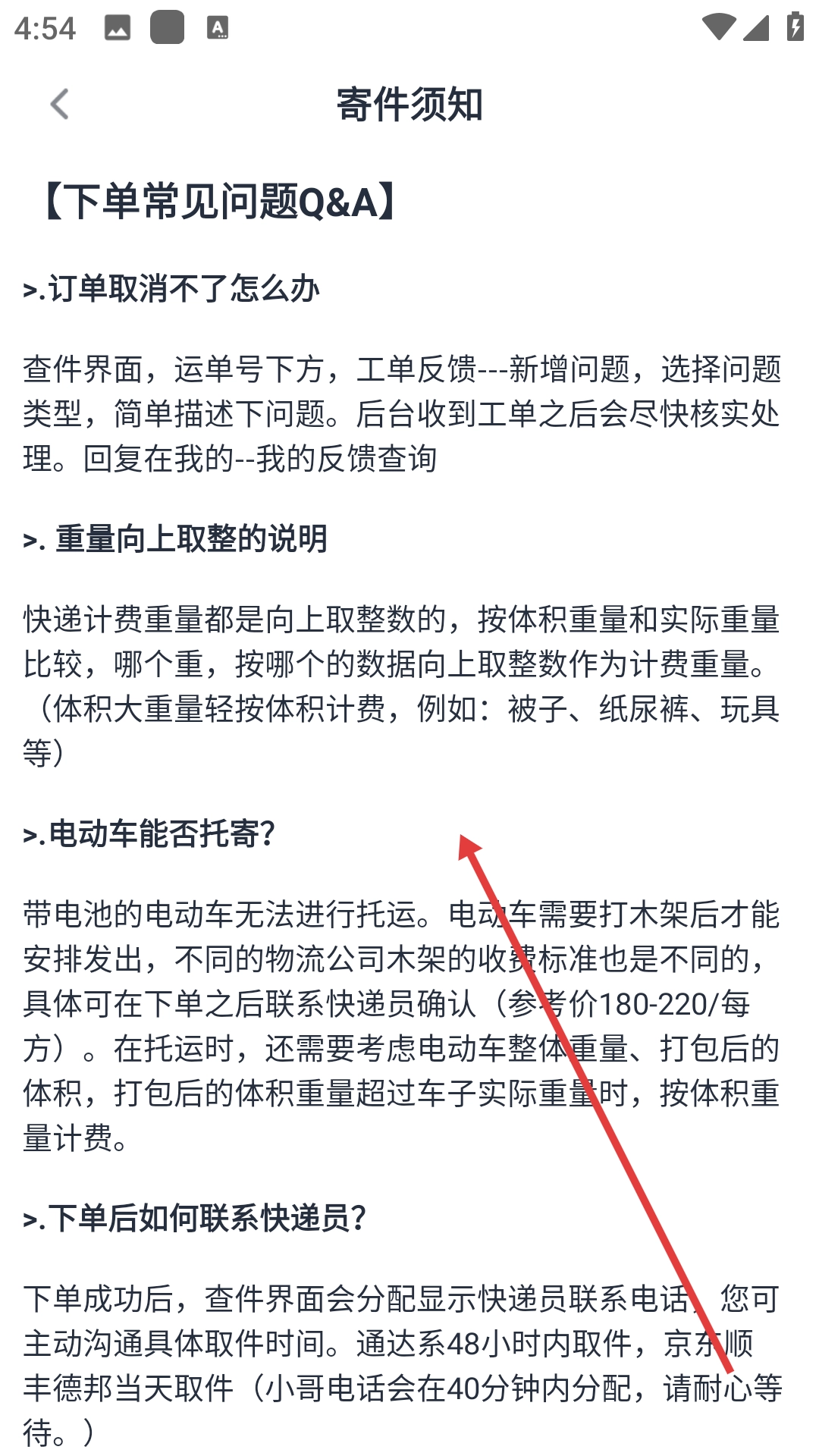 在寄件须知页面可以查看下单常见问题的Q&A,其中包含订单取消、重量计费、电动车托寄等方面的相关说明。