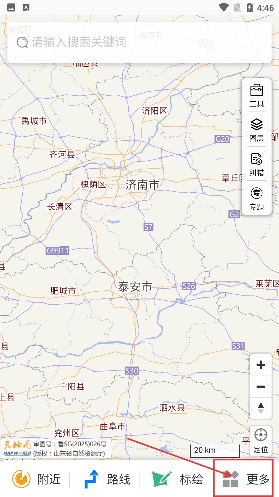 打开天地图·山东软件后,点击右下角的【更多】按钮,即可进入更多功能页面。