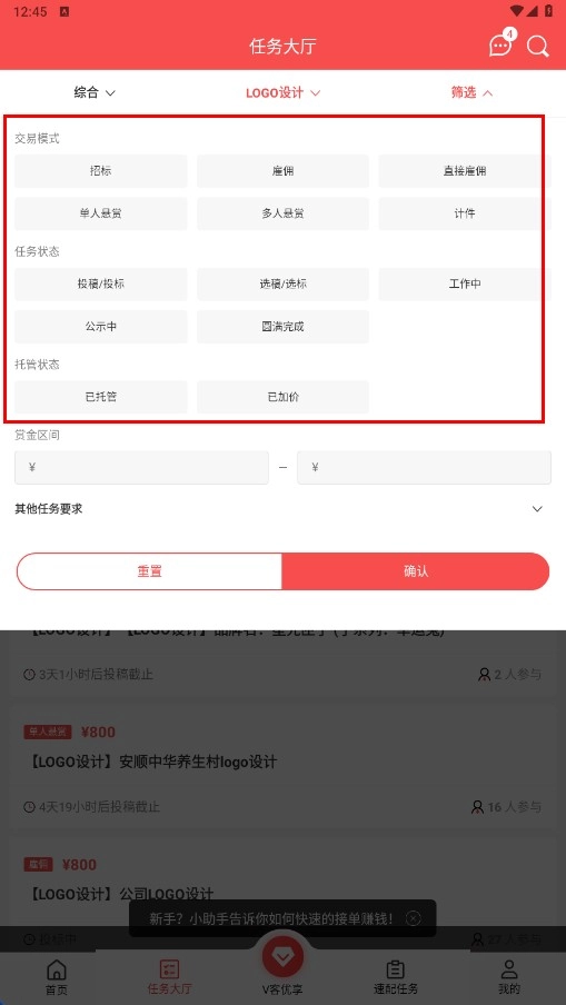 可以借助筛选功能,对任务进行筛选时,可选择交易模式、任务状态、托管状态以及赏金区间等条件。