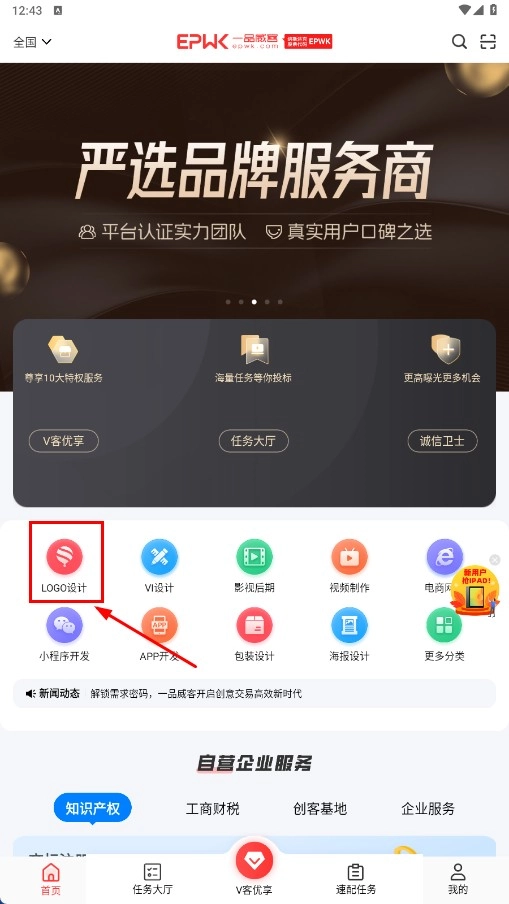 点击【LOGO设计】功能按钮,即可进入任务大厅的LOGO设计任务列表页面。