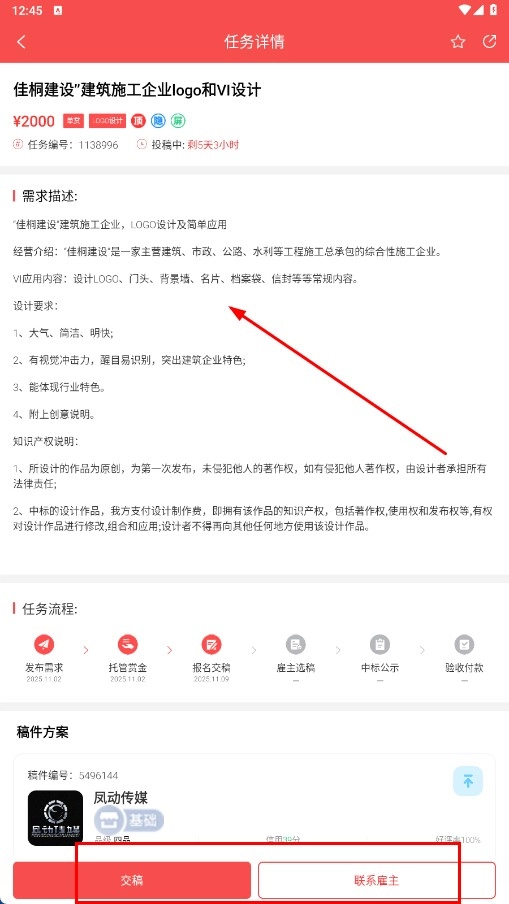 进入任务详情页面,查看需求描述后,您可以点击【交稿】或【联系雇主】按钮来参与该任务。