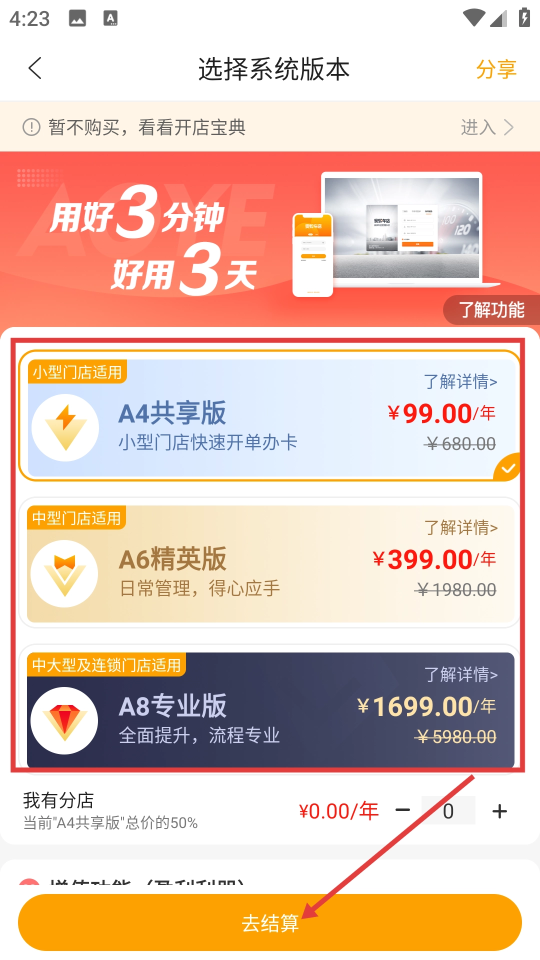 选择结束后点击【去结算】按钮,即可完成开店时系统版本的选定与结算流程。
