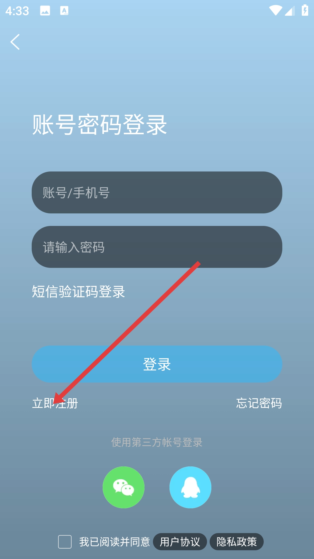 在账号密码登录页面,要是还没有注册过账号,点击【立即注册】就能开启注册步骤,另外也可以选用短信验证码登录或者第三方账号登录的方式。