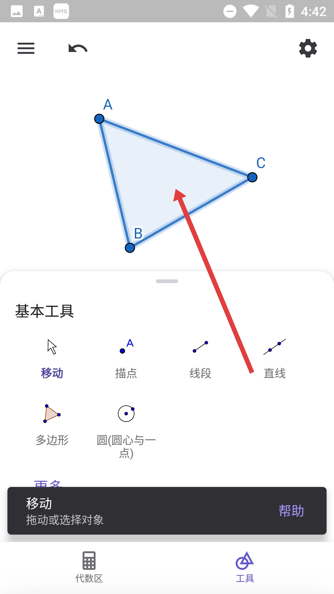 要绘制三角形,可按顺序选定顶点A、B、C并完成闭合操作;绘制结束后,使用移动工具就能调整该图形的位置。