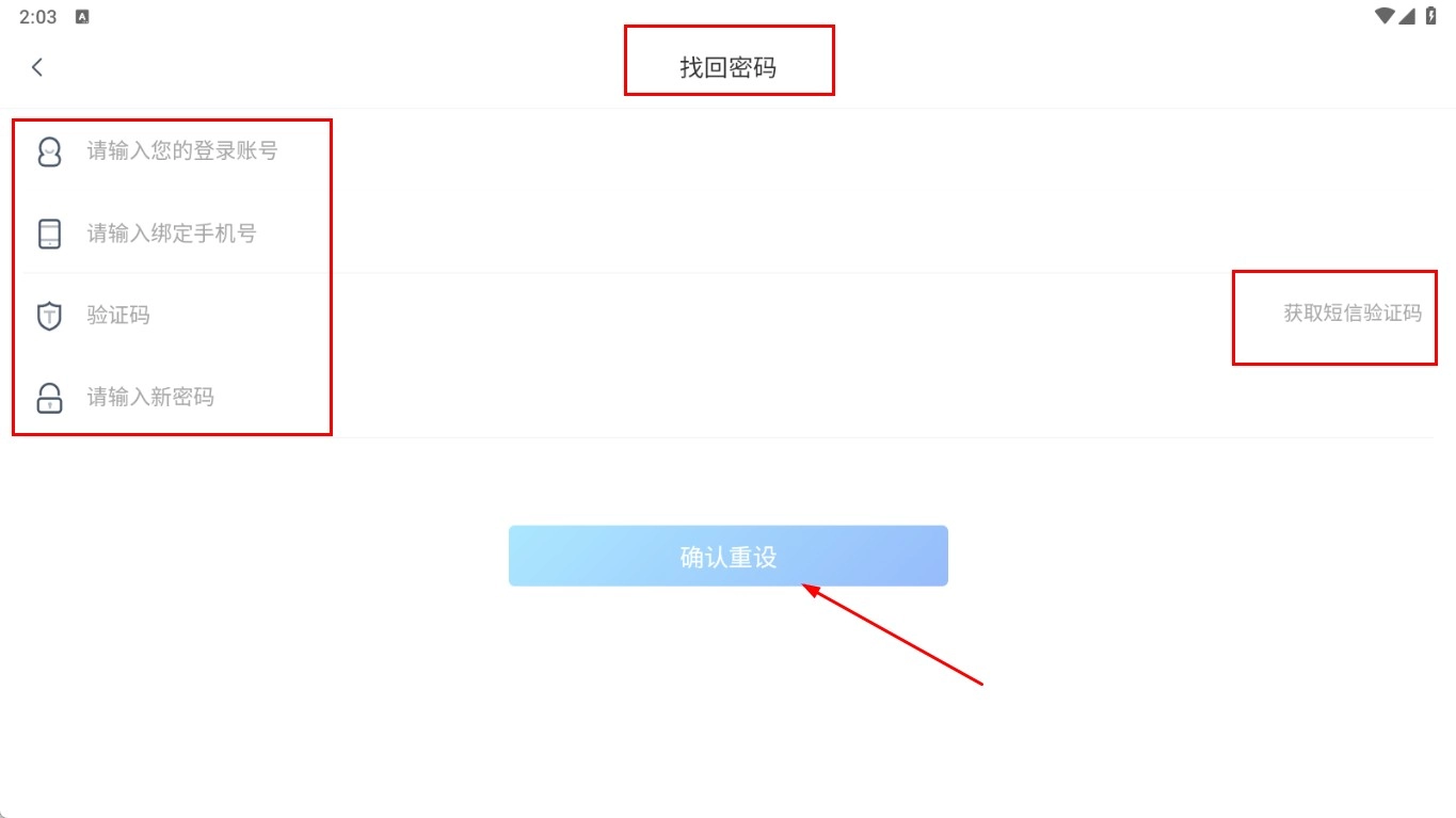 在密码找回页面,填写登录账号与绑定的手机号,获取并输入验证码,设置好新密码后点击【确认重设】功能按钮,即可完成密码重置操作。
