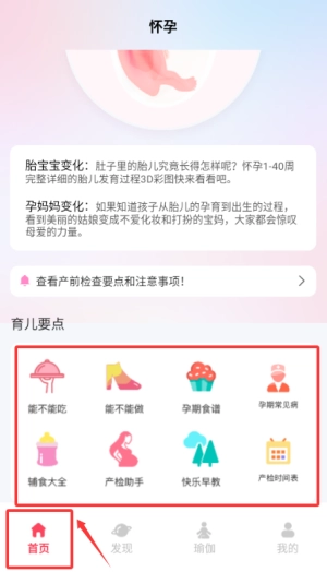 浏览首页育儿知识板块,查看饮食宜忌等指导内容。