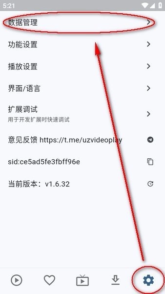 打开uz影视后,点击右下角的设置选项,接着选择“数据管理”。