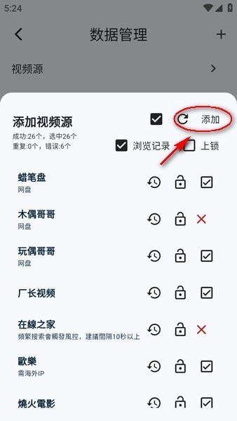 正在加载源,请耐心等待视频源出现。待视频源显示后,勾选全部选项,然后点击“添加”按钮。