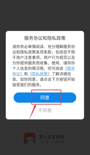 在育儿宝宝相册里点击“同意”服务协议,就能进入程序界面。