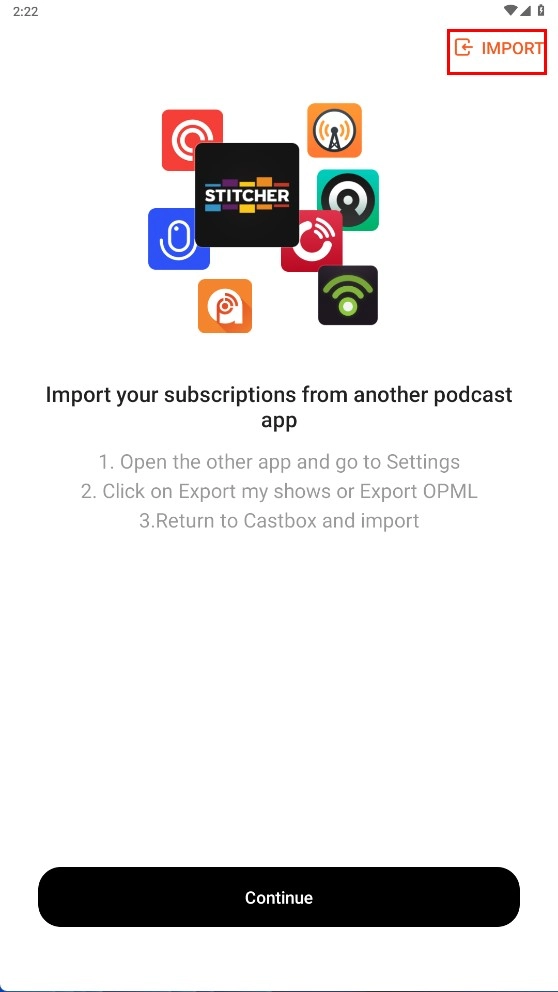 你可以在应用里找到【Import】功能入口,通过它能把其他播客应用的订阅内容导入进来,按照提示步骤完成导出和导入的操作就可以了。