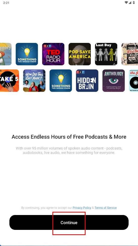 打开【Castbox】进入初始页面,点击底部的【Continue】按钮,就能浏览大量免费的播客和音频内容了。