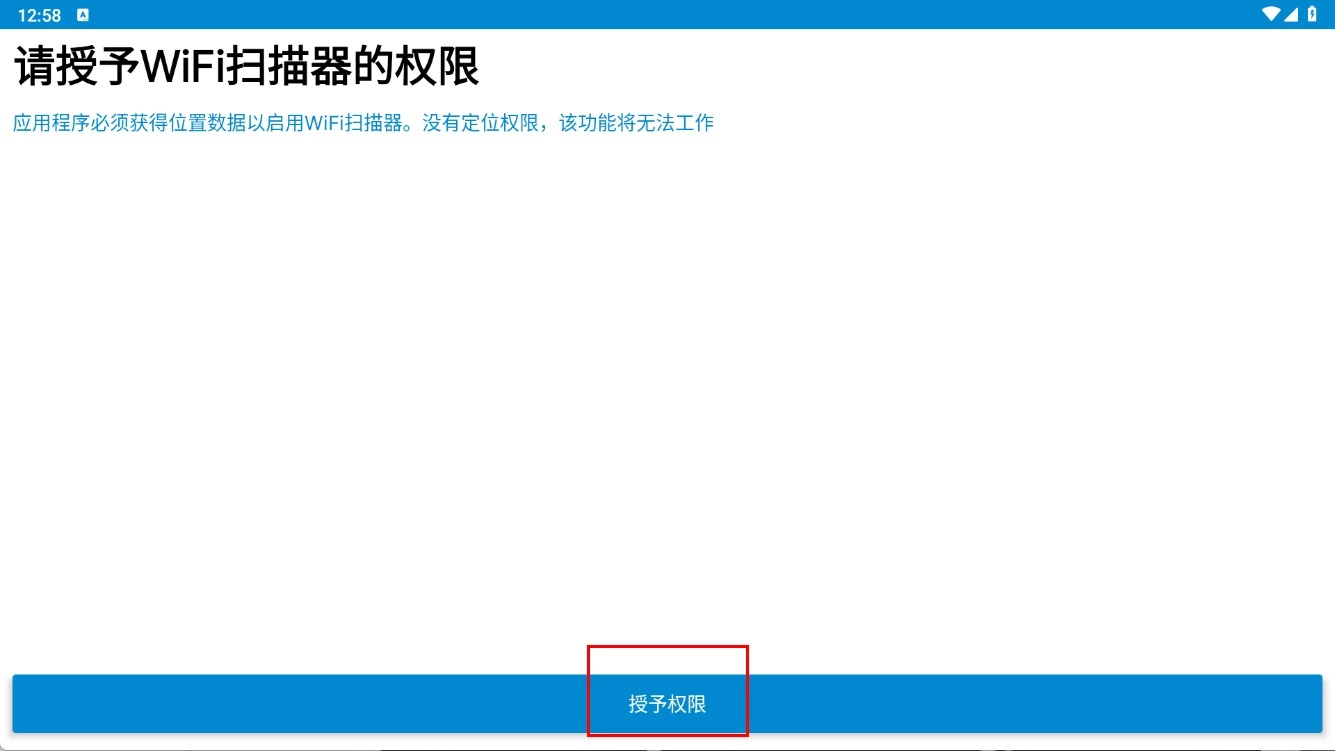 在使用【WiFi分析器】之前,需要授予位置权限来开启扫描功能,请点击【授予权限】按钮来完成授权步骤。