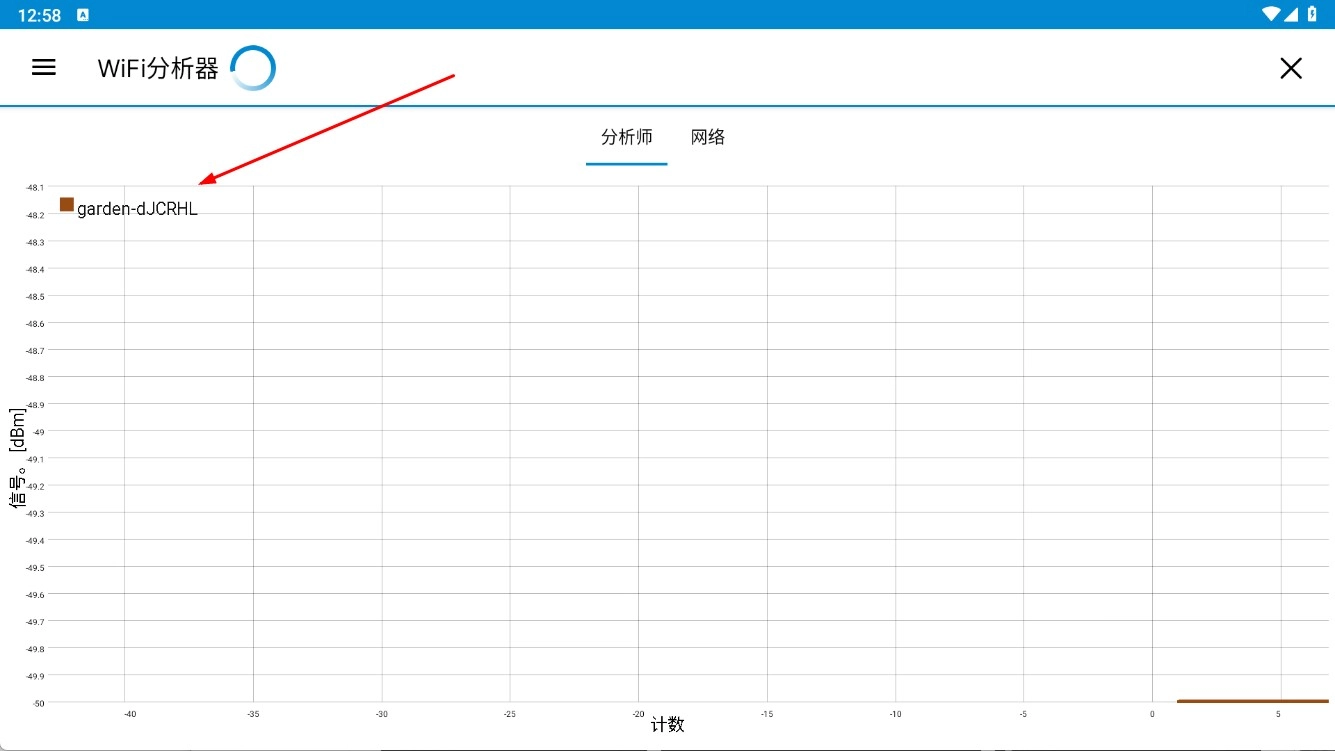 打开【WiFi分析器】应用,进入【分析师】界面,查看【garden-dJCRHL】等无线网络的信号强度图表。