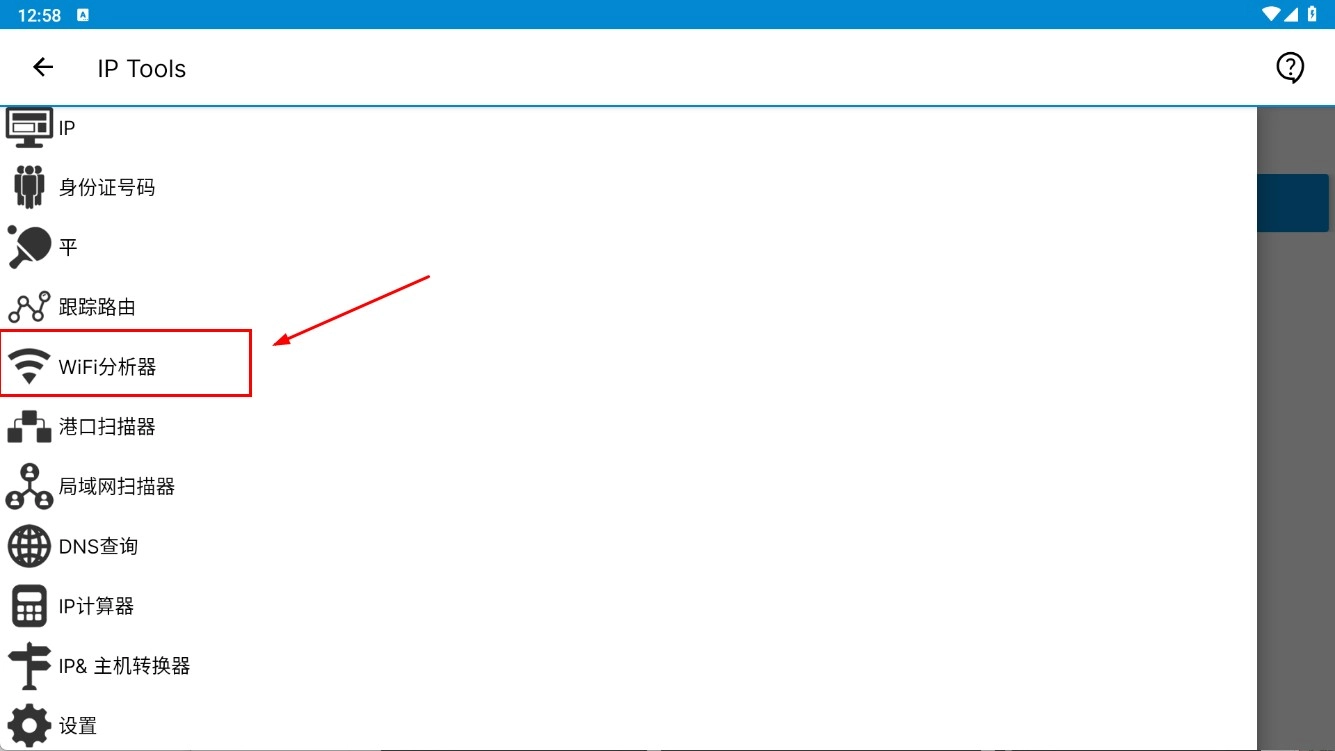 打开【IPTools】应用,接着在功能列表里找到并选择【WiFi分析器】,进入该功能模块后即可启动网络分析。