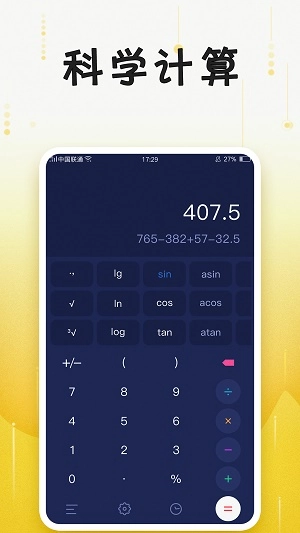 【科学计算器】支持对数函数、三角函数、绝对值、反三角函数、阶乘、随机数、最大值最小值、平方根、定积分、微分函数、排列组合、最大公约数、最小公倍数等算法以及常数算法。
