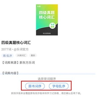 2、随意选择了一个词库,它将弹出背词顺序的选择按钮,你可以在原书词序与字母乱序中进行选择,如下图所示: