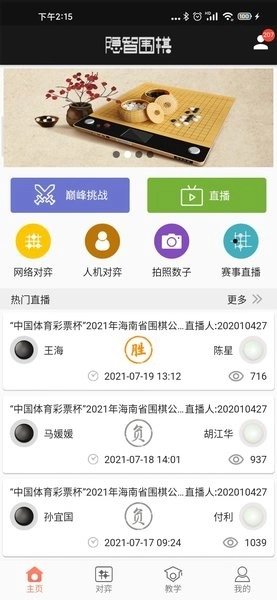 赛事直播:支持查看隐智智能棋盘当前开展的线下赛事对局,以及棋盘用户的公开对局。
