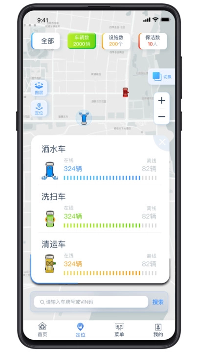 能够精准定位每台不同型号车辆的详细信息,像今天有多少辆洒水车处于在线状态、每辆车的具体行程路线,在软件里都能清晰查看,另外也可以通过搜索功能快速找到特定的某一辆车。