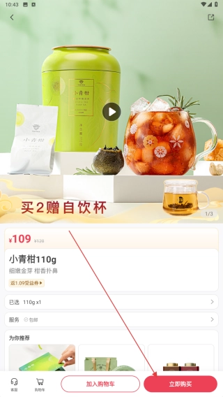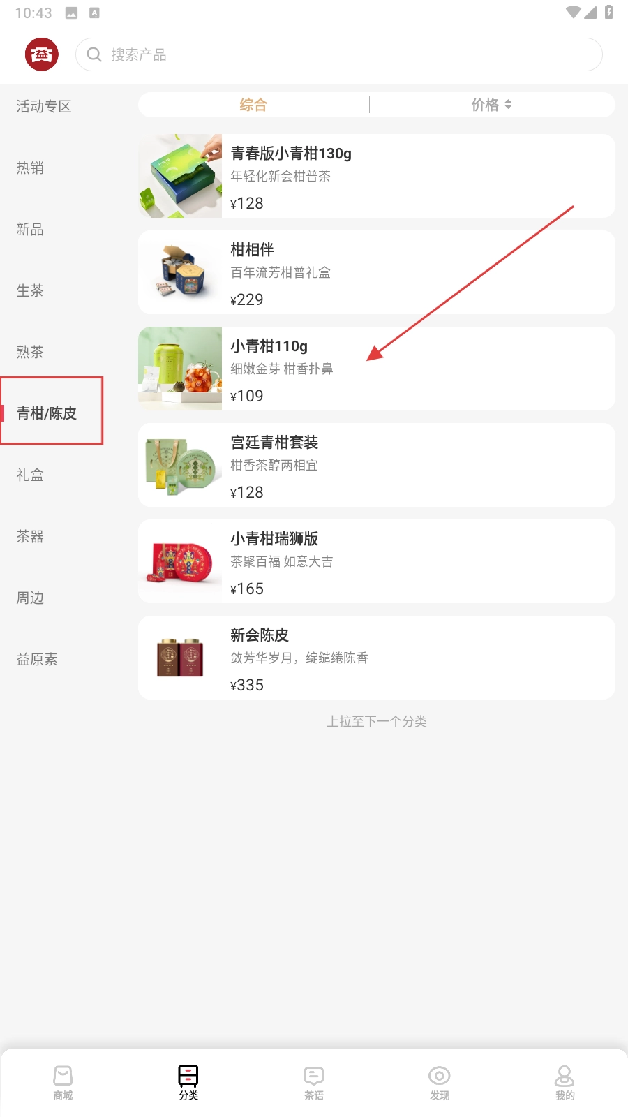 在分类页面挑选自己喜欢的茶类,比如【青柑/陈皮-小青柑110g】这一款。