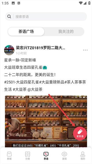 在茶语广场页面,点击右下角的“发茶语”按钮。