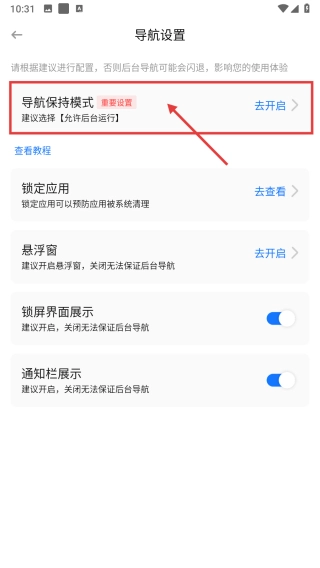 在导航设置页面中,找到并点击“导航保持模式”选项,进入对应的模式设置界面后,将该模式开启即可。