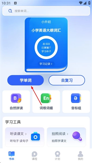 在《奇思妙想记单词》的书本页面,点击“学单词”按钮,即可进入单词学习页面。