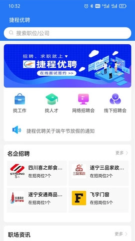 捷程优聘是四川捷程优聘人力资源服务有限公司推出的全职招聘应用,整合了遂宁本地企业招聘与个人求职等多元功能,属于专业招聘平台。求职者可依据自身兴趣及专业背景,在平台检索适配职位。平台职位信息详尽且实时更新,助力求职者及时掌握最新招聘资讯。通过该平台,求职者能投递简历、与企业沟通并安排面试,有效提升求职成功率。